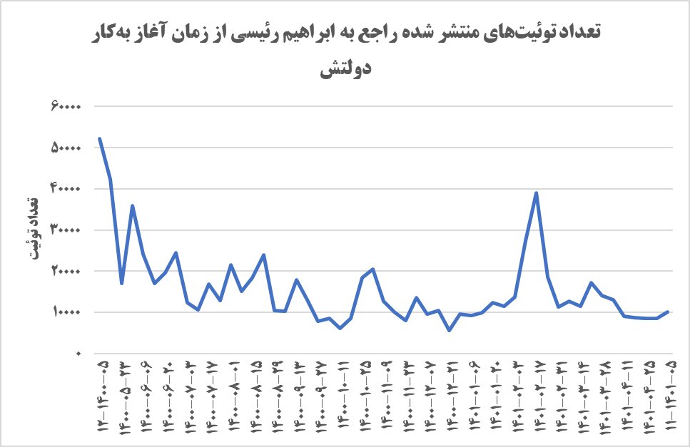 تحلیل دادههای توییتری نشان میدهد که فضای توییتر در یک سال گذشته کاملا منتقد عملکرد ابراهیم رئیسی و دولت او بوده است و طیف گستردهای اعم از اصولگرا، اصلاحطلب و مخالفان جمهوری اسلامی در طول این یک سال توییتهای انتقادی بر علیه دولت رئیسی داشتهاند. البته حمایتهایی هم از دولت رئیسی انجام شده است که به مرور زمان هر چقدر از آغاز به کار دولت او گذشته، از شدت و میزان این حمایتها نیز کاسته شده و توییتهای حمایتی نیز کمتر لایک خورده است. در طول این یک سال بیش از ۸۱۳ هزار توییت در مورد ابراهیم رئیسی زده شده است و این توییتها بیش از ۱۳ میلیون بار لایک شده؛ لایکهایی که عمدتا معطوف به توییتهای انتقادی بوده است.