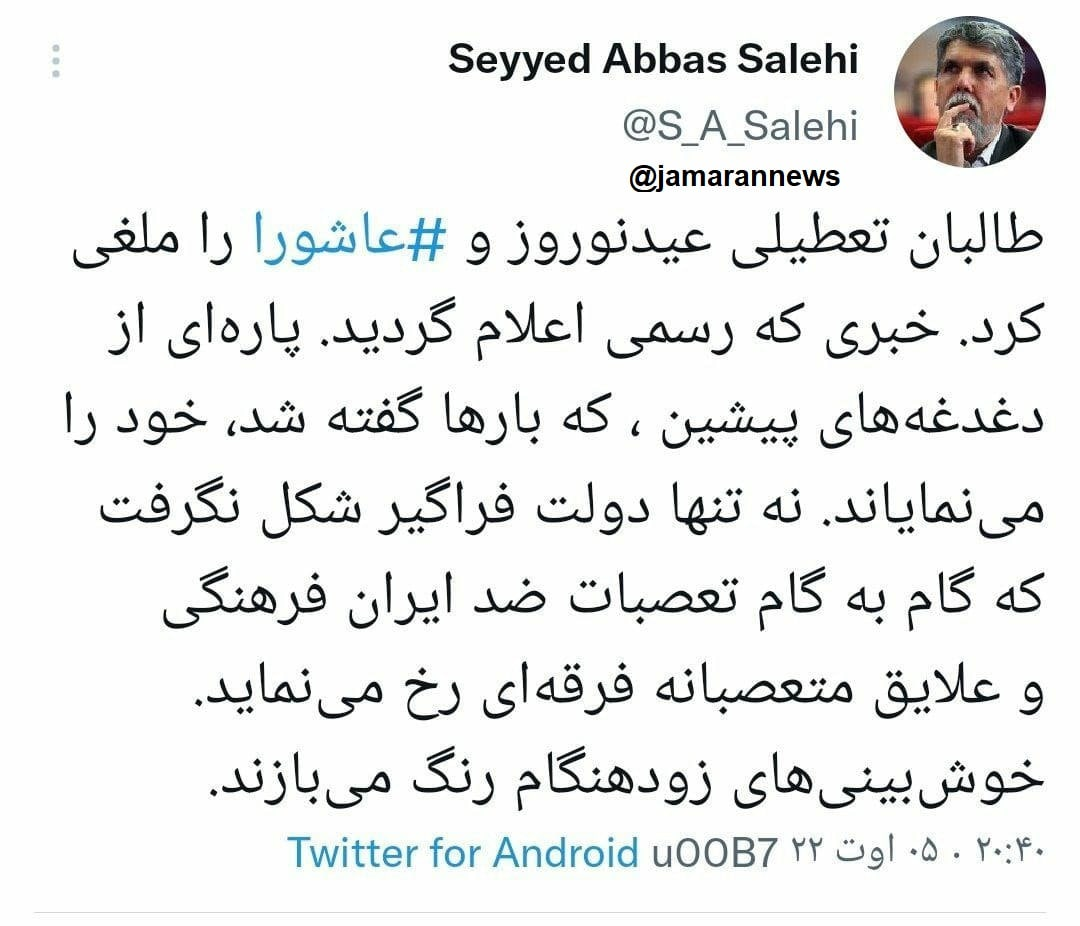 صالحی حذف «تعطیلی عید نوروز و عاشورا » را نمادی از «تعصبات ضد ایران» طالبان دانست.