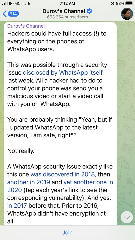 من اینجا به مردم فشار نمیآورم که به تلگرام بروند. با بیش از 700 میلیون کاربر فعال و بیش از 2 میلیون ثبت نام روزانه، تلگرام نیازی به تبلیغات اضافی ندارد. میتوانید از هر برنامه پیامرسانی که دوست دارید استفاده کنید، اما از واتساپ دوری کنید – اکنون واتس اپ 14 سال است که به عنوان یک ابزار نظارتی استفاده می شود