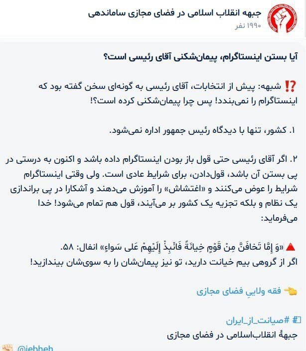 اول اینکه همه تصمیمات در کشور بر اساس دیدگاه رییس جمهور نیست و بعد اینکه چون اینستاگرام عامل اتفاقات اخیر بوده تصمیم رییسی تغییر کرده پس او پیمان شکنی نکرده است.