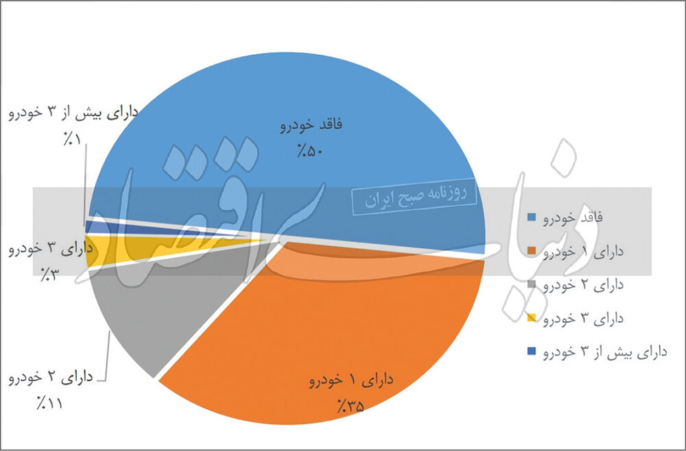 در گزارشی که مرکز پژوهشهای مجلس شورایاسلامی منتشر کرده، خانوارهای ایرانی از منظر داشتن یا نداشتن خودروی شخصی به پنج گروه تقسیم شدهاند. در این نمودار که از دل آمارهای پایگاه رفاه ایرانیان استخراجشده، پنج گروه موردنظر عبارتند از: «خانوارهای فاقد خودرو»، «خانوارهای دارای یک خودرو»، «خانوارهای دارای دو خودرو»، «خانوارهای دارای سه خودرو» و «خانوارهای دارای بیش از سه خودرو.» در این بین، سهم خانوارهای فاقد خودرو با 50درصد، از همه بیشتر است و از آنسو خانوارهای دارای بیش از سه خودرو کمترین سهم را دارند.