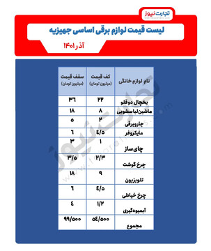 همچنین برای خرید یک تلویزیون باید بین ۹ میلیون تا ۱۸ میلیون تومان دست به جیب شد. البته این قیمت متناسب با سایز تلویزیون و امکانات آن حتی میتواند به ۲۵ میلیون تومان هم برسد.