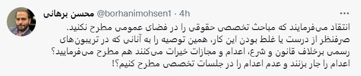 انتقاد می فرمایند که مباحث تخصصی حقوقی را درفضای عمومی مطرح نکنید . صرف نظر از درست یا غلط بودن این کار همین توصیه را به آنانی که در تربیون های رسمی برخلاف قانون و شرع اعدام و مجازات خیرت می کنند هم مطرح می فرمایید ؟ اعدام را جار بزنند و عدم اعدام را در جلسات تخصص مطرح کنیم ؟!