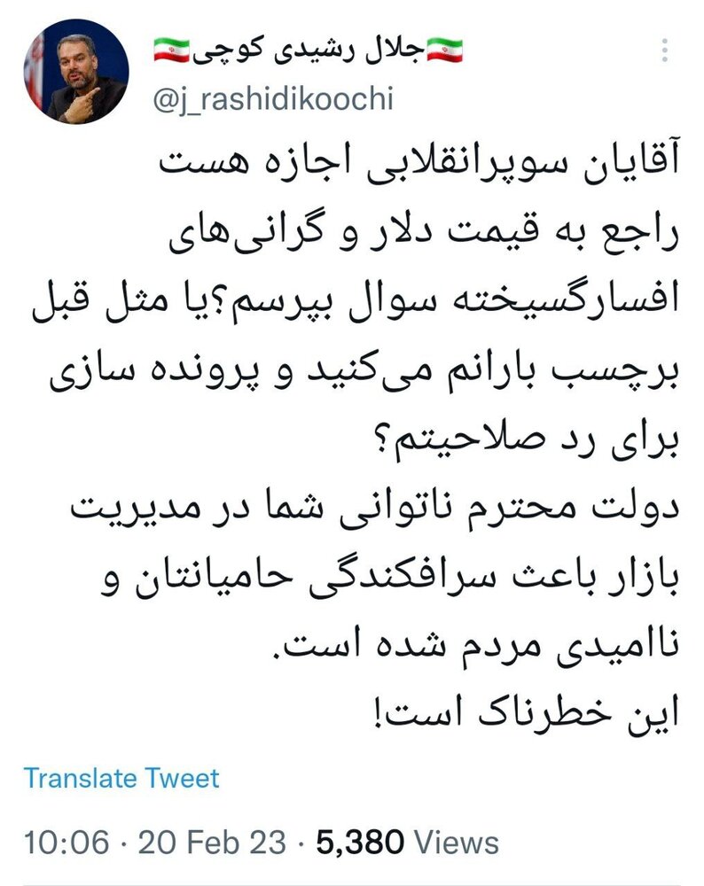 آقایان سوپرانقلابی اجازه هست راجع به قیمت دلار و گرانیهای افسارگسیخته سوال بپرسم؟ یا مثل قبل برچسب بارانم میکنید و پرونده سازی برای ردصلاحیتم؟