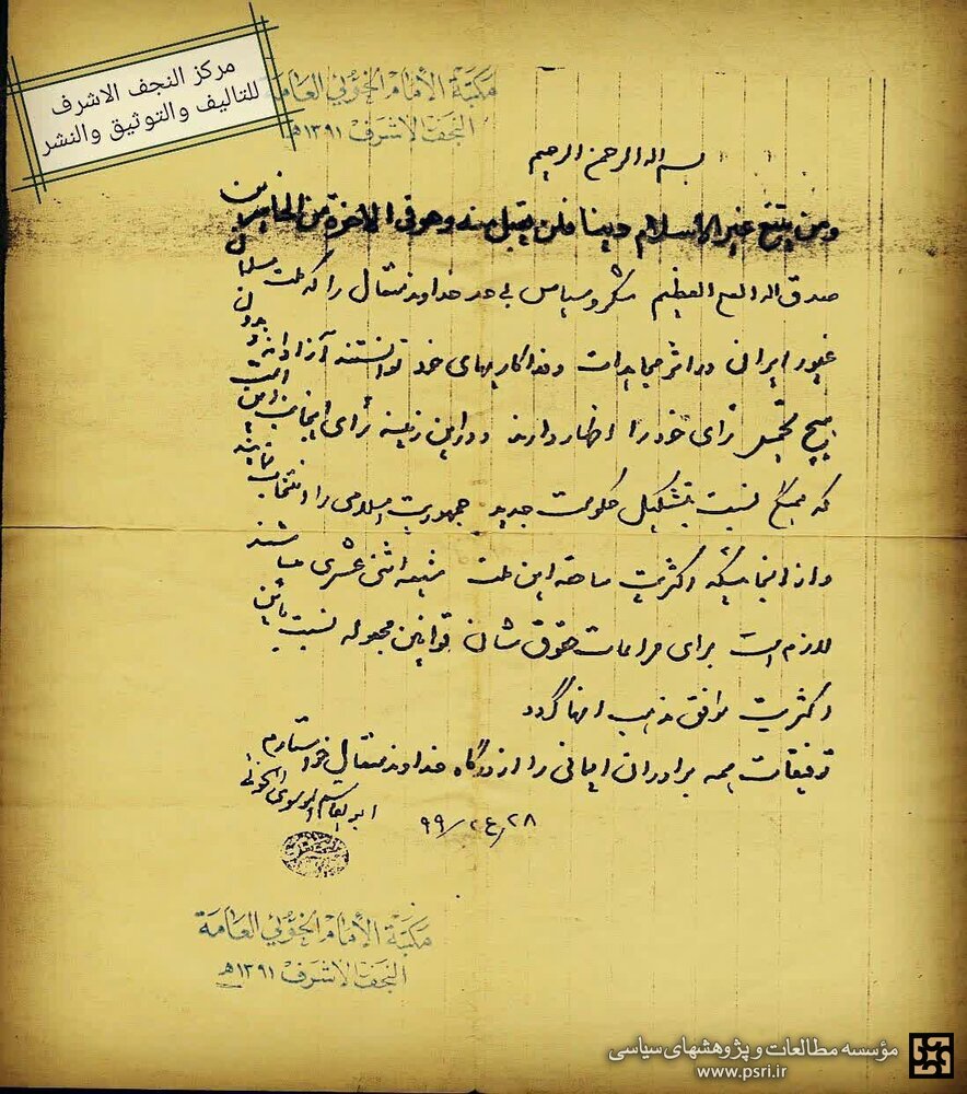 شکر و سپاس بی حد خداوند متعال را که ملت مسلمان غیور ایران در اثر مجاهدات و فداکاری های خود توانستند آزادانه و بدون هیچ تحمیلی رای خود را اظهار دارند و در این زمینه رای اینجانب این است که همگی نسبت به تشکیل حکومت جدید جمهوریت اسلامی را انتخاب نمایند و از آنجایی که اکثریت ساحقه این ملت شیعه اثناعشری می باشند لازم است برای مراعات حقوقشان قوانین مجعوله نسبت به این اکثریت موافق مذهب آنها گردد.