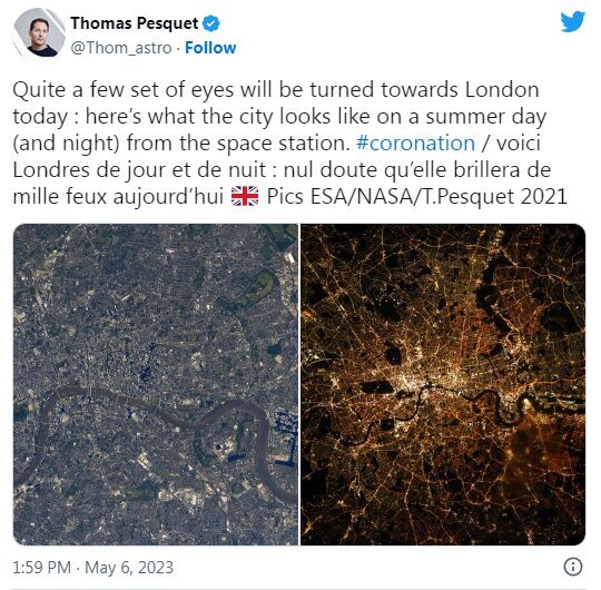 فضانوردان دیگر که در مراسم تاجگذاری حضور نداشتند، دیدگاه منحصربهفرد خود را در رسانههای اجتماعی به اشتراک گذاشتند. در طول این مراسم، «توماس پسکت»(Thomas Pesquet) فضانورد آژانس فضایی اروپا، تصویری را از لندن در توییتر منتشر کرد که در سال ۲۰۲۱ از «ایستگاه فضایی بینالمللی»(ISS) گرفته شده بود.