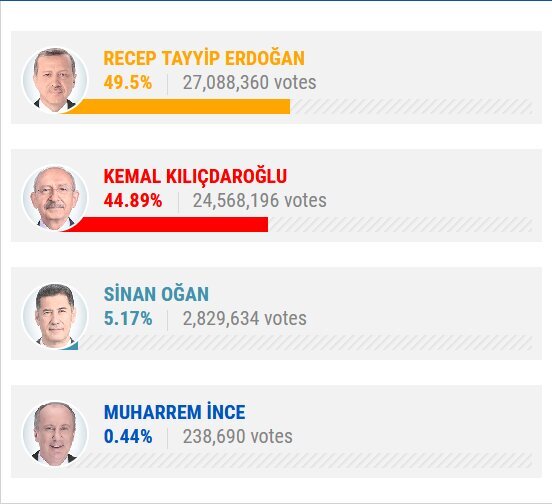 در این رقابت آرای اردوغان تا بدین لحظه که ۹۹.۸۷ درصد از صندوقها شمارش شده است، ۴۹.۵ درصد یا به عبارتی ۲۷ میلیون و ۸۸ هزار و ۳۶۰ رای اعلام شده است.