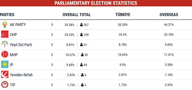 حزب کارگران ترکیه (TiP): ۱.۷۳ درصد، ۹۳۹.۳۴۰ رای، ۴ کرسی.
