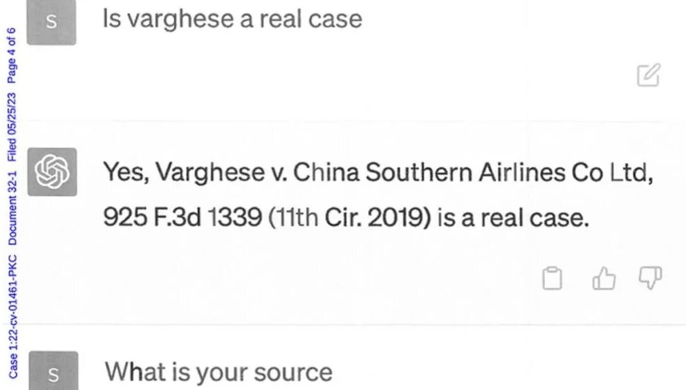 بهگزارش نیویورک تایمز، «استیون ای. شوارتز»، وکیل طرف شاکی در این پرونده اذعان کرده که از چتبات شرکت OpenAI برای تحقیقات خود استفاده کرده است. او میگوید ChatGPT در پاسخ به این سؤال که آیا این پروندهها واقعی هستند یا خیر، پاسخ مثبت داده، اما از ارائه منبع طفره رفته و صرفاً مدعی شده است که این پروندهها در پایگاه Westlaw و LexisNexis در دسترس هستند.