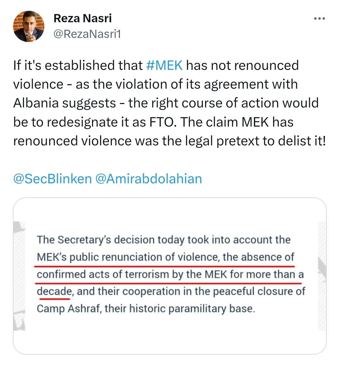 اگر محرز شود که سازمان مجاهدین خلق «خشونت» را کنار نگذاشته است – همانطور که نقض توافق آن با آلبانی نشان میدهد – اقدام درست این است که دولت آمریکا آن را دوباره به عنوان FTO لیستگذاری کند. فراموش نکنیم ادعای اینکه سازمان مجاهدین خلق از مشی خشونتآمیز دست کشیده است، بستر قانونی حذف آن از این فهرست بود!