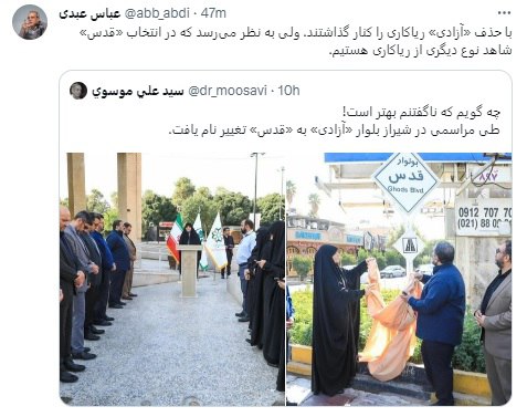 اما اینکه چرا اعضای شورای شهر شیراز برای اینکه بتوانند نام قدس را روی معابر شهرشان بگذارند خیابان جدیدی را انتخاب نکردند، یا اینکه برای انتخاب خیابان، آن معبری را انتخای کردند که نام قبلیاش آزادی است، مورد توجه برخی کنشگران قرار گرفت. مثلاً عباس عبدی، فعال سیاسی و رسانهای در شبکه اجتماعی ایکس (توئیتر) نوشت: «با حذف آزادی ریاکاری را کنار گذاشتید، ولی به نظر میرسد که در انتخاب قدس شاهد نوع دیگری از ریاکاری هستیم.»