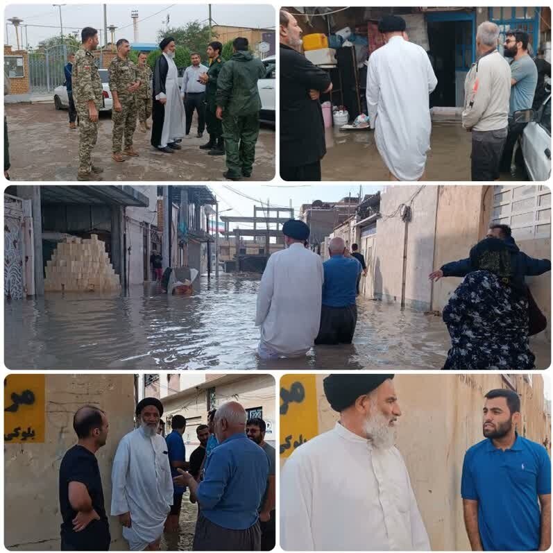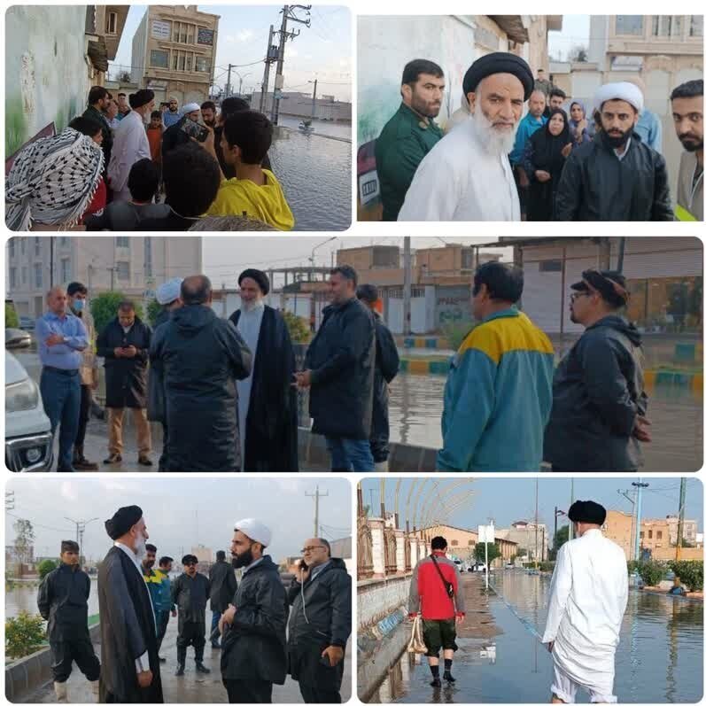 حجت الاسلام سید محمدنبی موسویفرد نماینده ولی فقیه در خوزستان و امام جمعه اهواز برای بررسی از وضعیت آبگرفتگی شهر شهید چمران و بندرامام خمینی(ره) از مناطق مناطق مختلف این شهرها که به دلیل بارش اخیر دچار آبگرفتگی شدهاند بازدید کرد.