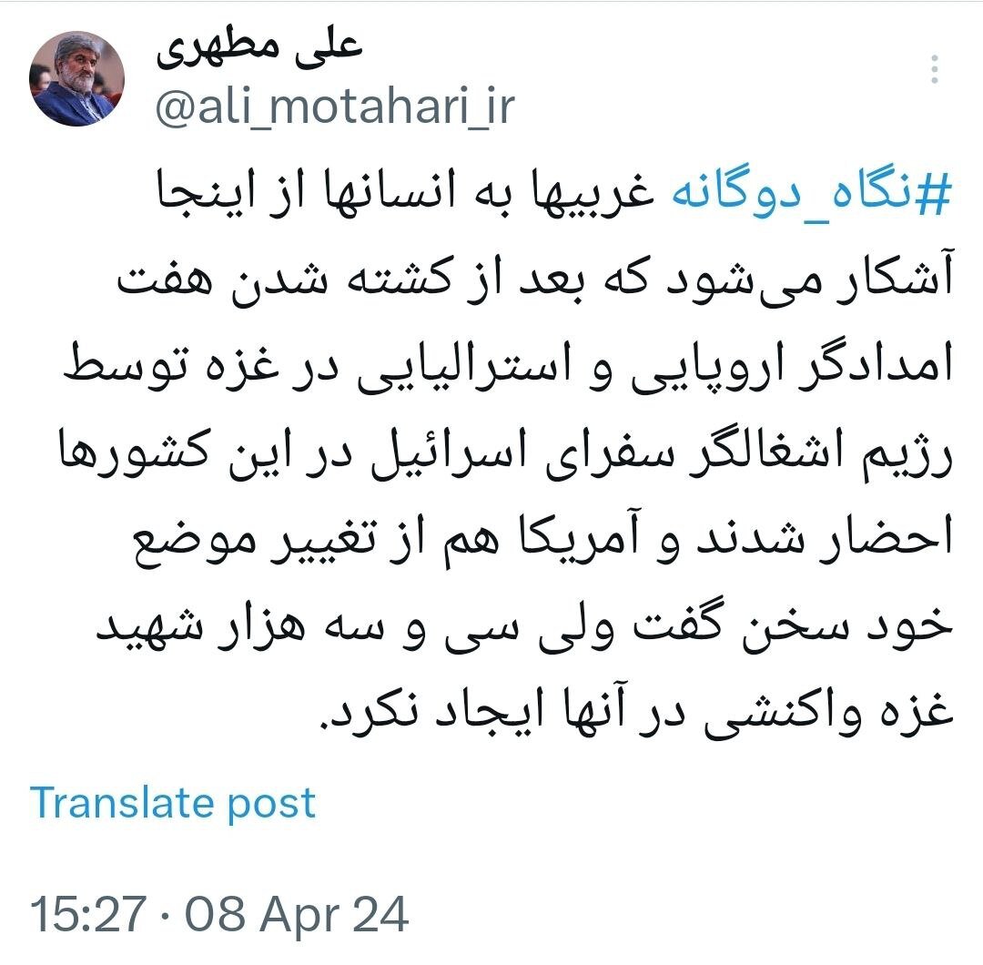کنایه سنگین علی مطهری به اروپا و آمریکا بعد از کشته شدن ۷ امدادگر اروپایی و استرالیایی در غزه