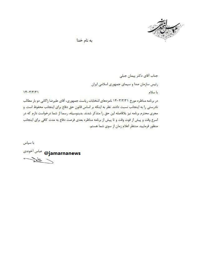 به گزارش خبرگزاری خبرانلاین، عباس آخوندی، وزیر راه و شهرسازی در دولت روحانی در نامه ای به پیمان جبلی، رئیس صداوسیما، خواستار دریافت فرصتی شد تا پاسخ اتهامات مطرح شده از سوی علیرضا زاکانی کاندیدای انتخابات ریاست جمهوری در مناظره امشب را ارائه کند.