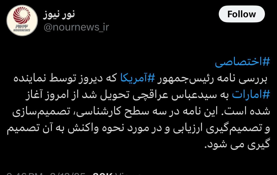 به گزارش خبرگزاری خبرآنلاین، نورنیوز در شبکه اجتماعی ایکس با اشاره به نامه ترامپ به ایران نوشت: «بررسی نامه رئیسجمهور آمریکا که دیروز توسط نماینده امارات به سیدعباس عراقچی تحویل شد از امروز آغاز شده است. این نامه در سه سطح کارشناسی، تصمیمسازی و تصمیمگیری ارزیابی و در مورد نحوه واکنش به آن تصمیم گیری میشود.»